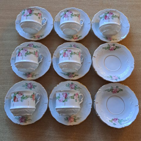 Sæt bestående af fem vintage porcelænskopper med tilhørende underkopper. Designet inkluderer forskellige blomster- og guldtonemønstre på kopperne. Store 7,5 cm og små 12 cm i diameteren. Elegant og klassisk udseende, ideelt til samlere eller dem, der ønsker at tilføje et retro touch til deres kaffestund.