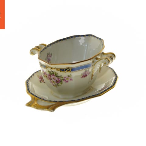 Cremefarvet bund med flot dekoration i kongeblåt og med små rosa blomster og fine forgyldninger.