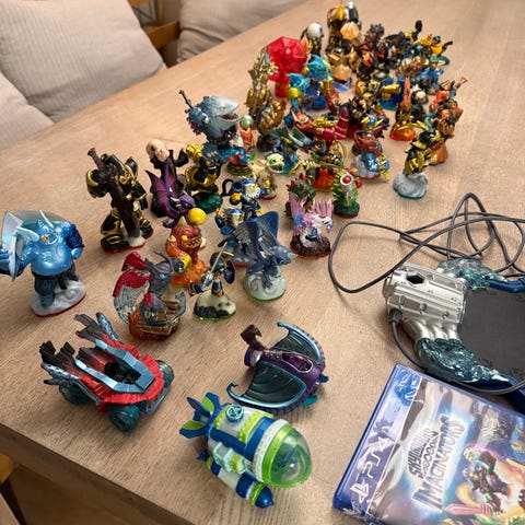 Denne samling indeholder flere Skylanders-portaler, der bruges til at spille Skylanders-spil på forskellige konsoller. Portalerne har USB-kabler til tilslutning og er lavet af plast og elektroniske komponenter. De har varierende designs, med primært blåt og gråt farveskema, og kan bruges til at placere Skylanders-figurer, som aktiveres i spillet, når de er på portalen.