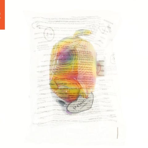 Denne bamse er farverig med en kombination af gul, blå, grøn, og rød. Den er pakket ind i plastemballage, som har tekst trykt på den. Bamsen ser ud til at have store øjne og en blød overflade, typisk for tøjdyr.