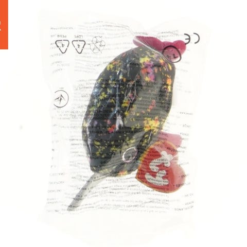 Dette er en Beanie Baby fisk indpakket i plastemballage. Den har en farverig ydre med nuancer af primært blå og grøn, og små glitrende øjne. Den er letgenkendelig som en del af Beanie Baby legetøjsserien. Den måler omkring 10 cm i længden.