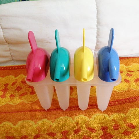 Dette er et sæt med seks isforme, perfekt til at lave hjemmelavede ispinde. Formene er monteret på en grøn base og kommer med forskellige farvede låg i lilla, orange, rød, blå, grøn og gul. Hver form har en tilhørende farvet pind til nem fjernelse af ispinden, når den er frosset. Formene er fremstillet af plastik og har en størrelse på 15 cm.