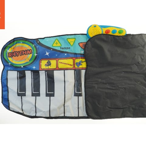 Dette er et interaktivt musiktæppe designet til børn. Tæppet ligner et klaver med tydeligt markerede tangenter, som kan aktiveres for at spille forskellige lydprogrammer. Det har en farverig overflade med musiske symboler som 'Rhythm' og 'Demo', hvilket giver en sjov og lærerig oplevelse for børn. Bagsiden af tæppet er sort med en rød kant. Tæppet består af letvægtsmateriale og har en størrelse på 180x65 cm. Det har et kontrolpanel øverst til at styre lyd og funktioner.