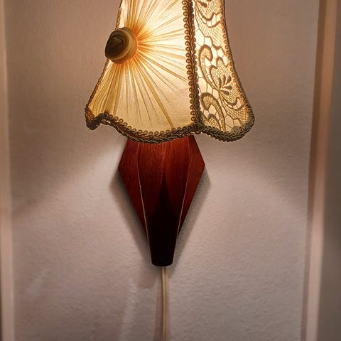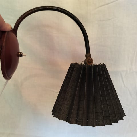 Lampen er ok fin, men med lidt patina på træ, skærm og ledning.