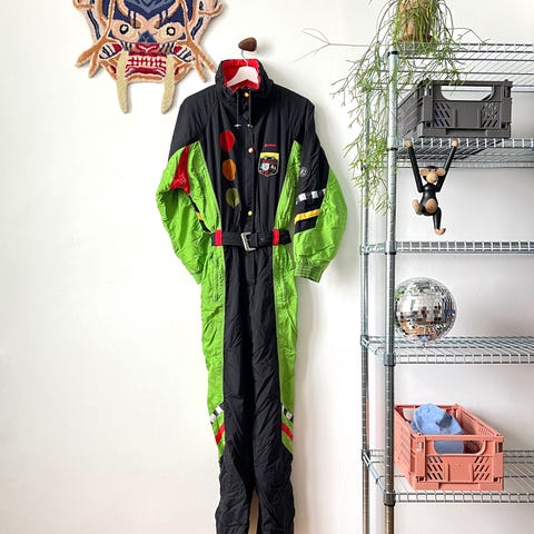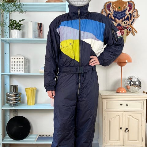 Beautiful unique vintage ski suit in great condition. Rare, never seen anywhere, this winter season you must have it! Made out of very comfortable, strong material. Zipped fastening, 1 inner and 3 outer pockets, BELT and has super batwing sleeves, high collar, perfect both for skiing or for casual wear. Zip and belt closure in front, zip pockets on sides.