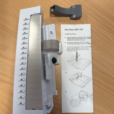 Ericsson DXY 419 01 01001 R2E telefonpanel med tilbehør. Produktet er designet og fremstillet af Ericsson, og det indeholder en række knapper og porte til telefonfunktioner. Panelet er fremstillet i plastik og har en grå farve.
