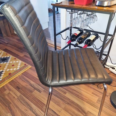 Stolene har sort læderlook (kunstlæder) med kromben og et stilrent, tidløst design, der passer perfekt til både moderne og klassiske hjem.