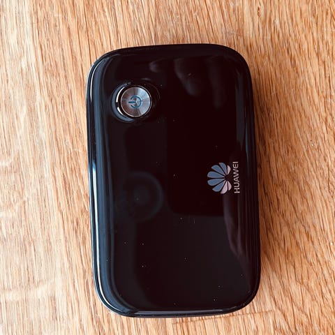 Huawei E5730s-2 Mobile WiFi modem med indbygget skærm. Enheden understøtter trådløs internetforbindelse via SIM-kort. Farve: Hvid.