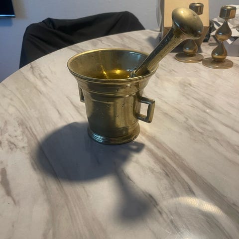 Sælges Messing Morder lille hak i kanten. H 10 cm pris 75 kr.