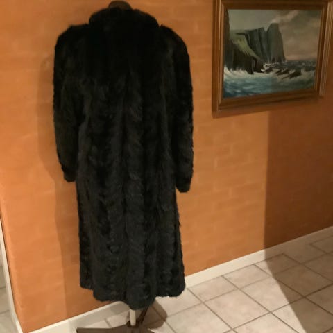 Den har 2 udvendige lommer og en indvendig lomme. Skjule pelshægter samt en stor knap i kraven. Opsmøg på begge ærmer.