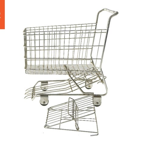 Miniature indkøbsvogne i metal med håndtag i pink, gul og grøn. Velegnet til dekoration eller som legetøj. Hver vogn er udstyret med små hjul og har et netlignende design i metal.
