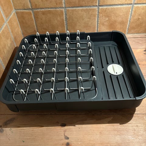 Grå. Tre dele. Kan gå i opvaskemaskinen. Plads til opvaskebørste, sulfo og karklud. Sendes ikke.