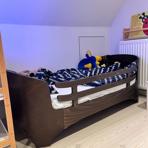 Som barneseng med tilbehør til at gøre madras og bund længere. (Madrasmål: 148 X 68 cm). Kan bruges som juniorseng indtil barnet er ca. 8 år.