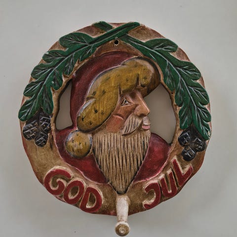Viser julemanden i sin stue.