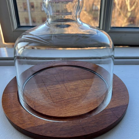 Dette er en Teak træ skål med glasindsats med glas låg. Glasskålen og træbasen passer sammen og fungerer som en opbevaringsenhed til ost, smør eller andre lignende varer. Størrelsen på objektet er Ø 18x10 cm. Tags: ost, låg, opbevaring, teak, træ, glas.
