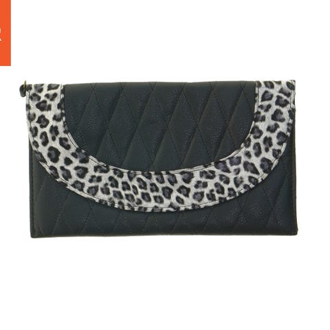 En lille pung med en størrelse på 10x9,5 cm, der har en nøglekæde for nemt at fastgøre til nøglebundtet eller tasken. Pungen er fremstillet med et pelse-lignende materiale i en tofärvet design, bestående af sort og beige. Der ses et mærkat med en original pris på 238 kr.