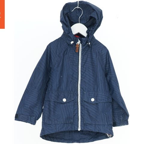 En letvægtsjakke i blå med en hætte. Jakken har lynlås foran og sidelommer med lynlås. Den har synlige Rebus-brandelementer som logoer og lynlås-tags.
