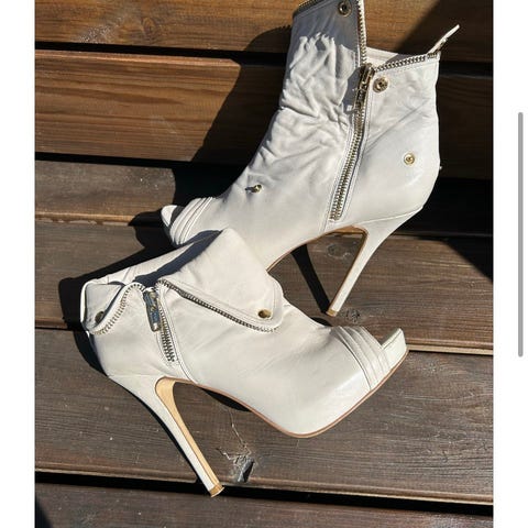 Disse stilfulde sko er designet med en åbent tå, høj hæl og en justerbar rem. Skoene er lavet af rød læder med lilla blomsterdetaljer ved tåen. Den indvendige sål er sølvfarvet, og størrelsen på skoene er 36. Skoene er lavet i Italien af mærket Fardin, og undersiden viser skomærkets logo samt nogle detaljer om modellen, herunder Art 732 og Prod Platino. Tags: sko, hæle, blondesko, stilfuld, italien.