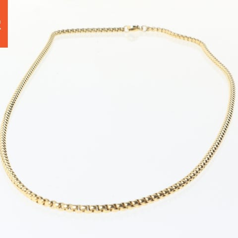 Den viste genstand er et guldkæde armbånd med rektangulære links. Armbåndet er af enkeltdesign med en sikkerhedslukning ved enden, der sikrer nem og sikker fastgørelse. Materialet ser ud til at være guld eller guldaktigt, hvilket giver en flot og elegant glans. Armbåndets omkreds er 10 cm, hvilket gør det egnet til håndled. Det kan let matches med forskellige outfits for et stilfuldt udseende. Tags: armbånd, kæde, guld, smykker