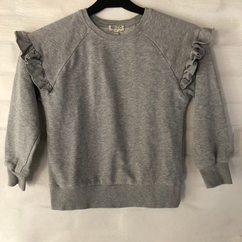 Kenzo sweatshirt til pige i størrelse 110. Sweatshirten er grå og lavet af bomuld. Den har lange ærmer med flæsedetaljer ved skuldrene. Fra dure- og røgfrit hjem. Kan afhentes i Brøndby, eller sendes på købers regning. Følg min profil - køb flere stk, og spar porto.