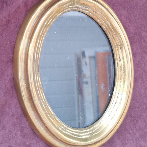 Dette er en dekorativ oval ramme lavet af messing, ideel til at fremhæve små billeder. Den har indviklede detaljer med ornamenter på siden og toppen, som tilføjer til dens antikke stil. Rammen har en størrelse på 16,5 cm. Bagsiden er udført i en solid form, der holder billedet sikkert. Tags: ramme, messing, oval, dekorativ.