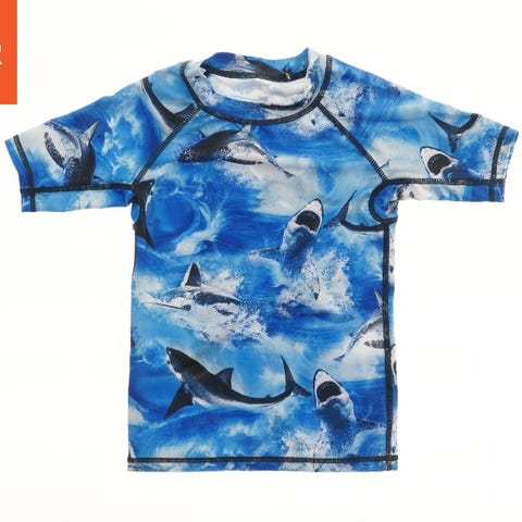 Langærmet UV-bluse med en farverig undervandsprint af hajer, fisk og havskildpadder. Blusen har gul kantning langs sømmene og er designet til at beskytte mod solens stråler.