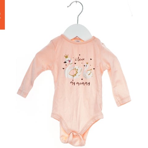 Bodystocking med lange ærmer og et motiv af to svaner med kroner og teksten 'I love my mommy' på forsiden. Den har en lyserød farve og er designet med knapper ved skulderen for nem påklædning. Den passer til størrelse 68.