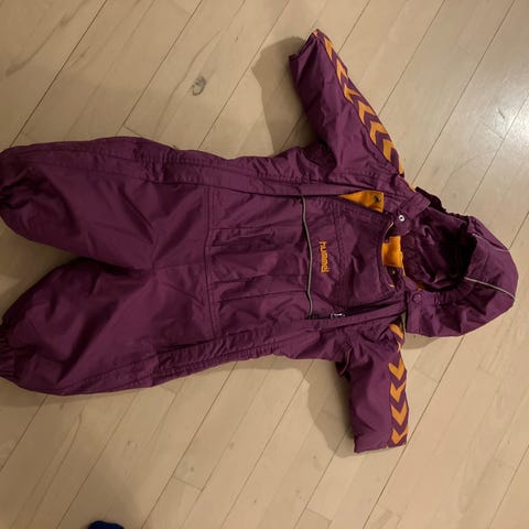 Flyverdragt til børn i lilla farve med hætte og lange ærmer. Dragten har en Hummel-logo på brystet og et hvidt chevron-mønster på ærmerne. Den er udstyret med lynlåslommer foran og elastik ved håndled og ankler. Velegnet til koldt vejr.