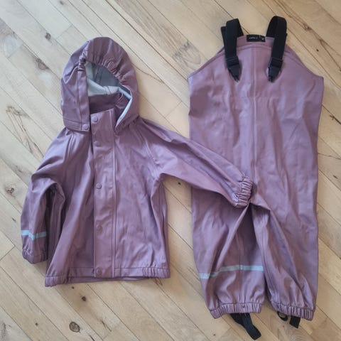 Sættet består af en sort jakke med aftagelig hætte og trykknaplukning samt sorte overalls med justerbare seler. Begge dele har elastikkanter ved ærmer og ben samt reflekterende stribe ved benene for øget synlighed.