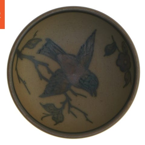 En lille keramikskål med en diameter på 9,5 cm og dekoration indeni, som viser en fugl og grene. Skålen har en brun farvetone med en let glans. Bunden af skålen har indgraverede tal og bogstaver.