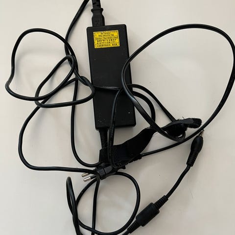 En Toshiba strømadapter med sort kabel og velcrobånd til samling. Adapteren har et standard stik til forbindelse med en enhed og er mærket med forskellige tekniske specifikationer og advarsler. Den ser ud til at være brugt, men i funktionsdygtig stand. Kan bruges til at oplade eller drive kompatible elektroniske enheder.
