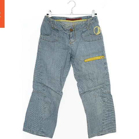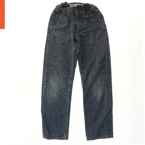 Et par børn jeans i blå denim. Bukserne har foran- og baglommer og en elastisk talje. Der er synlige slidmærker på stoffet, især ved knæene. Et ikonisk mærke logo er synligt på bagsiden.