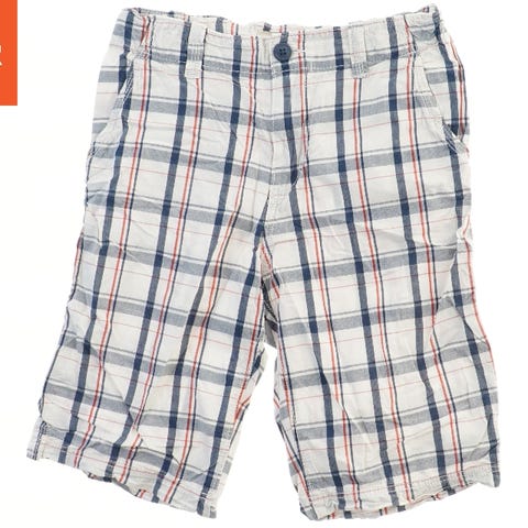 Et par shorts med et ternet mønster i blå, grønne, gule og hvide nuancer. Shortsene har elastisk talje med en snøre foran og en baglomme.