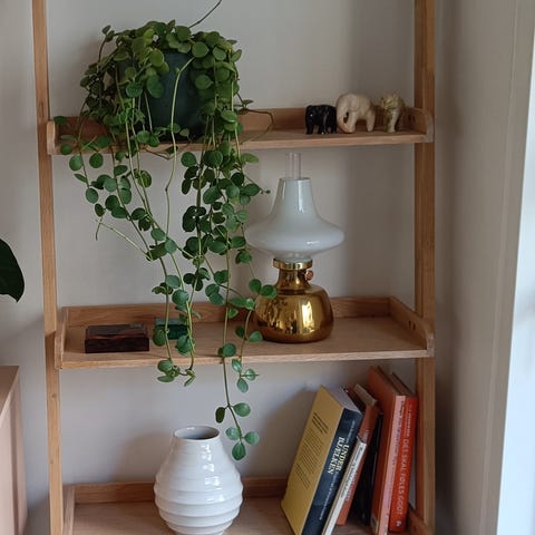 Klassisk stigereol med 6 stiger (bredde 28 cm, højde 179 cm), ét kryds, 17 alm. hylder (længde 76 og bredde 23,5 cm), 1 hylde 33 cm bred, 1 skrivebordsplade 50 cm bred. Har patina – men ellers OK.