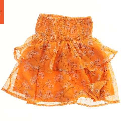En nederdel med blomster mønster. Nederdelen har en elastisk talje og flere lag. Den har lilla og pink blomsterprint på en brun baggrund.