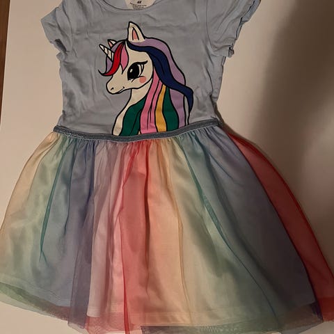 Denne nederdel er lavet af tylmateriale med et regnbuefarvet design. Den har guldglitterdetaljer over hele stoffet og en elastisk, gylden linning.