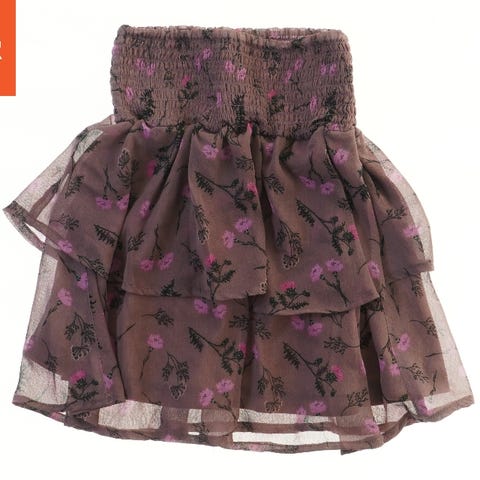 Denne nederdel har en elastisk talje og et lagdelt design. Den er lavet af let og transparent materiale med blomsterprint i hvide nuancer.