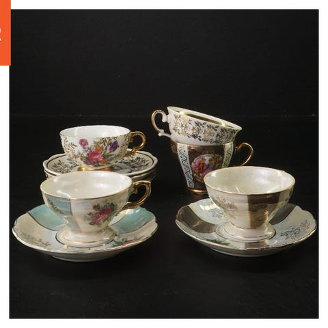 Dette er et sæt af seks kopper med en diameter på 9 cm. Kopperne har et detaljeret blomstermønster, der dekorerer deres udvendige side. Hver kop har en lille hank, der gør dem nemme at holde. Mønstrene er farverige og indeholder nuancer af grøn, blå og rød.