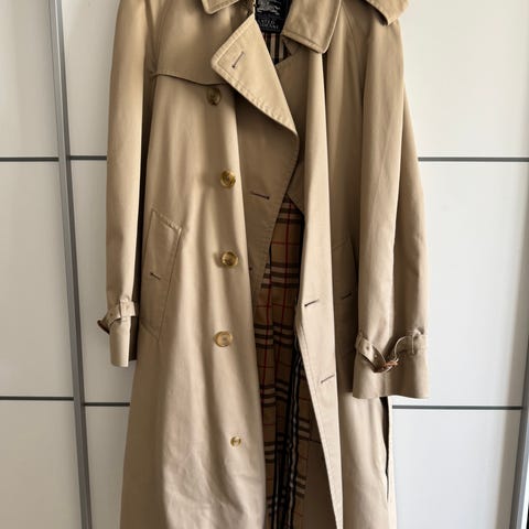 Blå frakke i størrelse XL lavet af akryll med Burberry design. Frakken har en klassisk pasform og er velegnet til herrebrug. Indvendigt foret med ternet mønster.