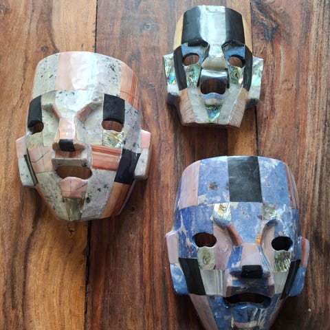 Maske af poleret perlemor og halvædelstene, Mexicansk dødsmaske, Maske af poleret perlemor og halvædelstene.