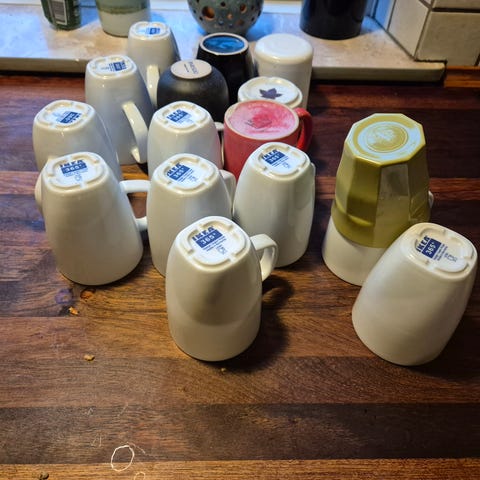 Kaffe/te krus i hvid porcelæn med mønstret overflade. Egnet til servering af varme drikke. 12 stk helt nye kopper, aldrig brugt, stadig i kasse. Byd gerne en pris