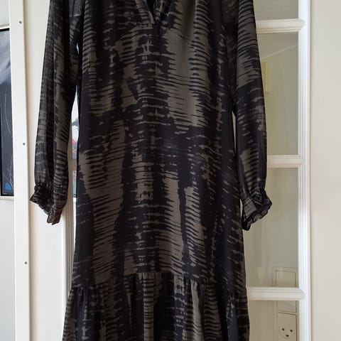 Rigtig pæn kjole uden ærmer, sort med hvide striber i underkanten af nederdelen og i overdelen. Har bådformet halsudskæring og lang lynlås bagpå.