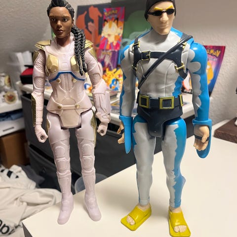 Actionfigur inspireret af Fortnite karakteren med et unikt design. Figuren er iført en hvid og gul dragt med masket ansigt. Den måler cirka 29,5 cm i højden og har detaljer som knapper og sko. Velegnet til samling eller leg.