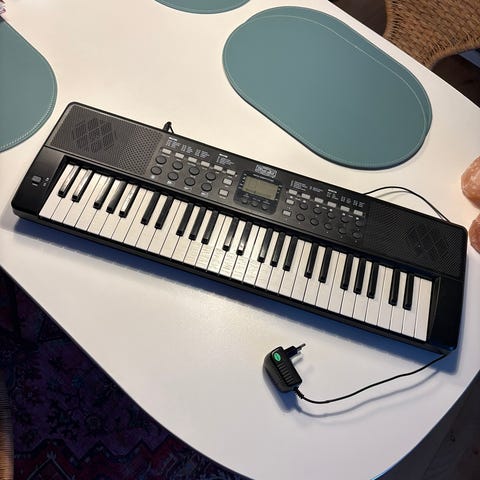 Rigtig fint begynder-keyboard til børn. Har 32 tangenter og masser af toner og melodier. Fungerer perfekt. Eneste brugsspor er små skrammer midt på de sorte tangenter,sø som det kan ses på nogle af billederne.