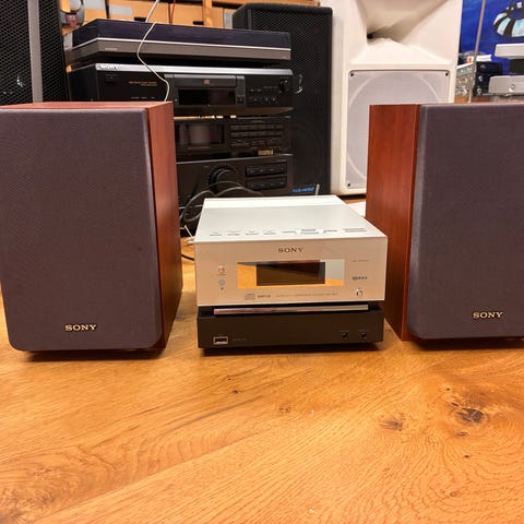Sony CMT-EH10, MICRO HI-FI COMPONENT SYSTEM MP3 med CD-afspiller og to Pioneer højttalere. Enheden har en kompakt disk receiver og leverer lyd til hjemmebrug.