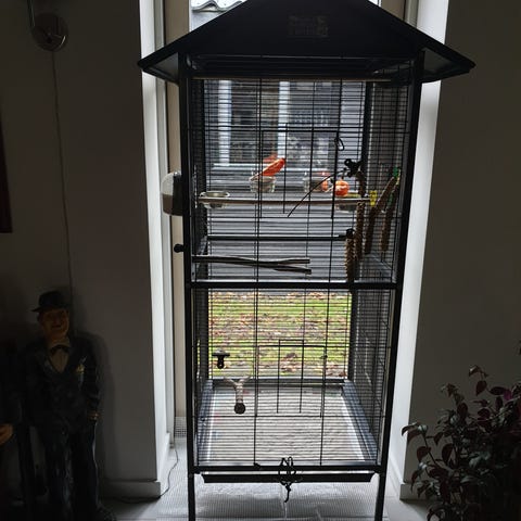 Fuglebur i hvid metal med tag. Buret er velegnet til opdræt eller som udendørs bolig for fugle. Det har en solid konstruktion og et tag, der beskytter mod vejrforhold. Men kan selvfølgelig også stå indenfor.
