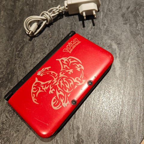 Brugt Nintendo 3DS XL, håndholdt spilkonsol i rød/sort farve. Den er oprindeligt købt i USA, og pinden er blevet væk siden. Der medfølger ikke original æske eller taske.