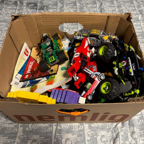 Blandet LEGO, det meste stammer fra Creationary. Jeg har også kort mv derfra. jeg har fyldt op med andet LEGO (se billede) så der er muligheder for at bygge. Mine lego brandbilerne også følger med