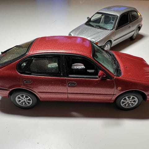 Meget detaljeret modelbil med detaljer som sidespejle og ekstra dæk under bilen.