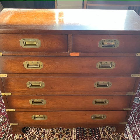 Kommode i lys melamin. 6 skuffer. velholdt men har 2 hakker i siden bagerts og et lille hak i toppladen som kun ses når man ved det. SENDES ikke og LEVERES ikke.